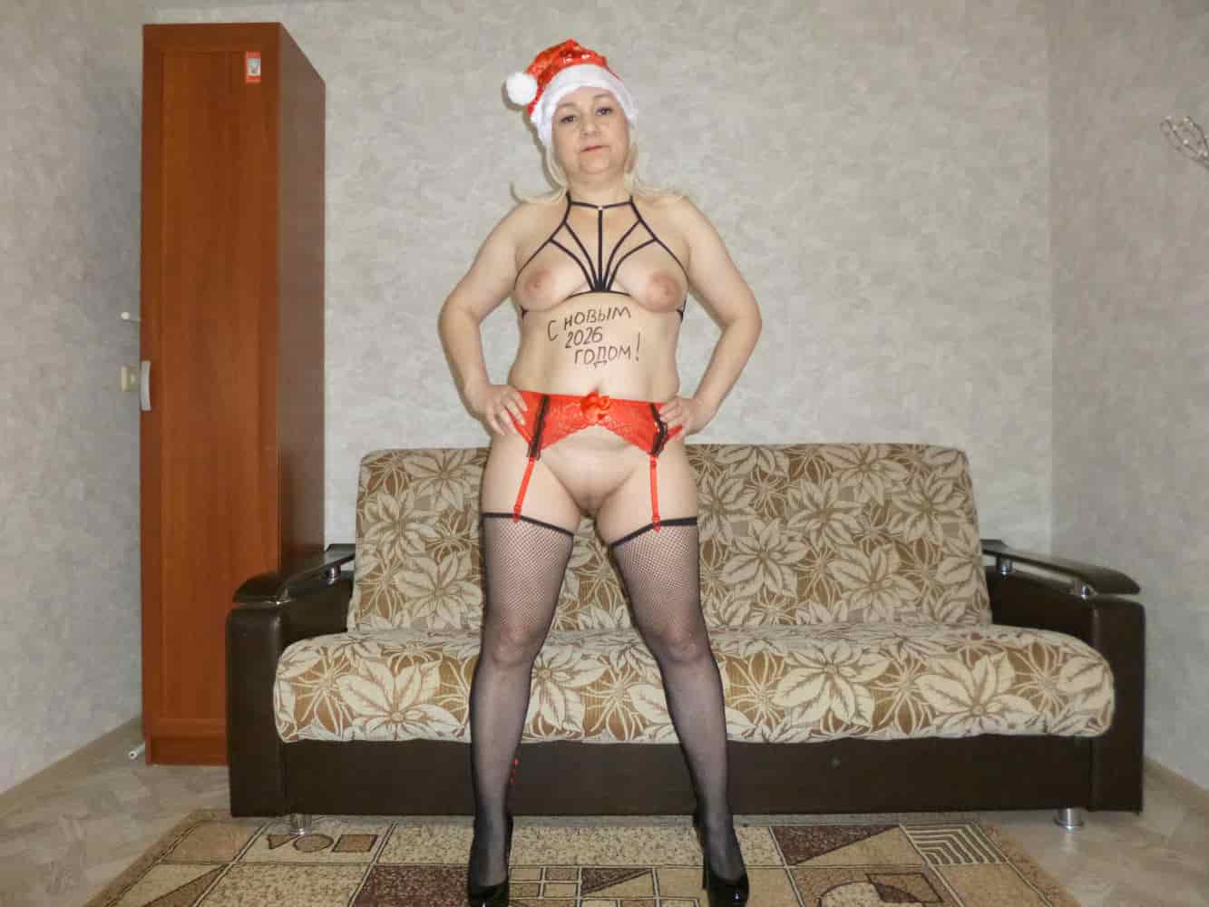 Этот фотосет — твой личный новогодний подарок от Наташи. Зрелая блонда с пухлыми губами и дерзким взглядом позирует прямо у двери в гостиной. На макушке болтается алая шапка Санты с помпоном — единственный намек на праздник. Все остальное — чистое искушение. Эротическое белье из черных ремней впивается в ее мягкий живот, открывая взгляду тяжелые, пышные груди с темными набухшими сосками. Она стоит, уперев руку в бедро, а ее взгляд словно говорит: «Распаковывай свой подарок».