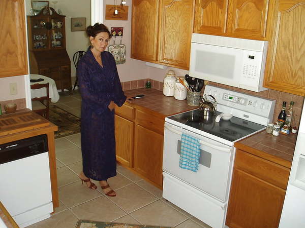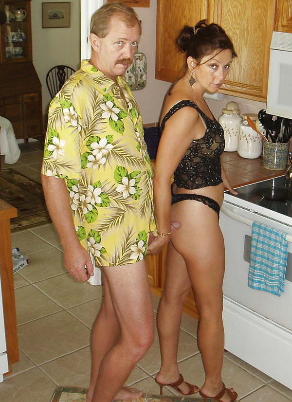 Зрелые супруги решили потрахаться и сделать несколько фото своего домашнего секса и не нашли места лучше чем заняться сексом на кухне. Зрелая жена приготовившись зашла на кухню и распахнула свой халат показала какое у нее красивое нижнее белье. Муж подойдя к жене снял с нее халат и нижнее белье поставил жену раком и вылизав ей пизду вставил свой торчащий упругий член в мокрую вагину своей зрелой жены. Выебав жену на кухне муж дал ей пососать хуй и кончил жене на лицо и на ее красивую грудь.